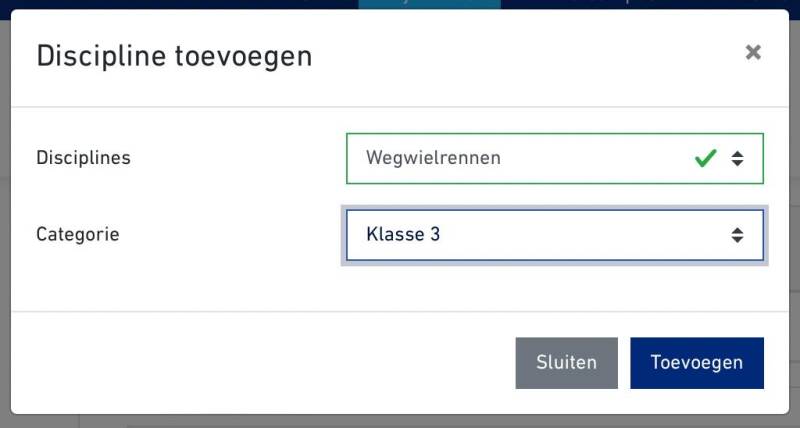 - Kies bij disciplines & niveau's: discipline toevoegen -> wegwielrennen / categorie: Klasse 3.